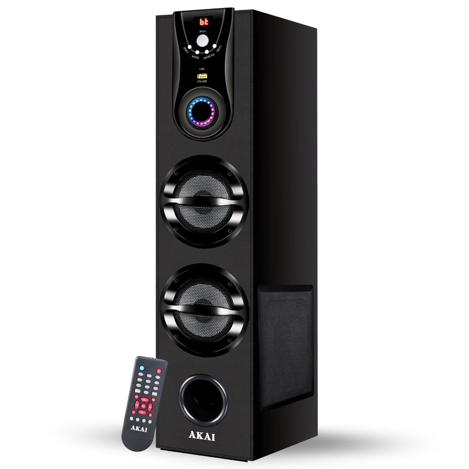 • AKAI Bluetooth Twin Tower Speaker with Wired Mic, 60W RMS, 5.25'' Woofer, Remote Control, Karaoke, LED Display, FM, Black, TWS-600Max