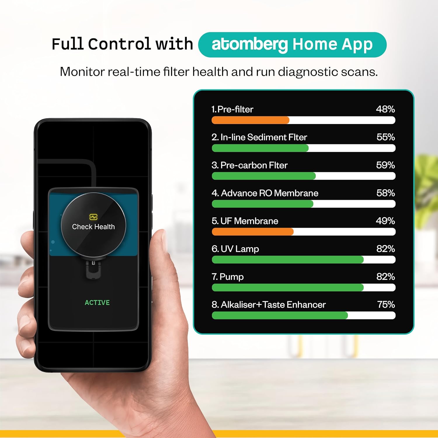 Atomberg 8 Liter Water Purifier with RO+UF+UV+Alkaliser, 4 Modes, TDS-Based Filtration, IOT, 7-Stage Purification, Retains Minerals, Black, Intellon
