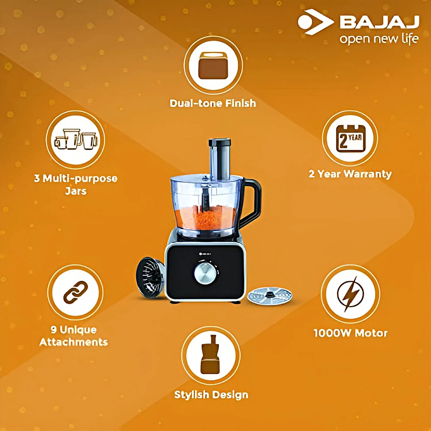 Bajaj FX-1000 Dlx, 1000 Watts Food Processor And Mixer Grinder With 9 Attachments, 100% Copper Motor, Processing Bowl With 3 Jars, Safety Interlock, Black