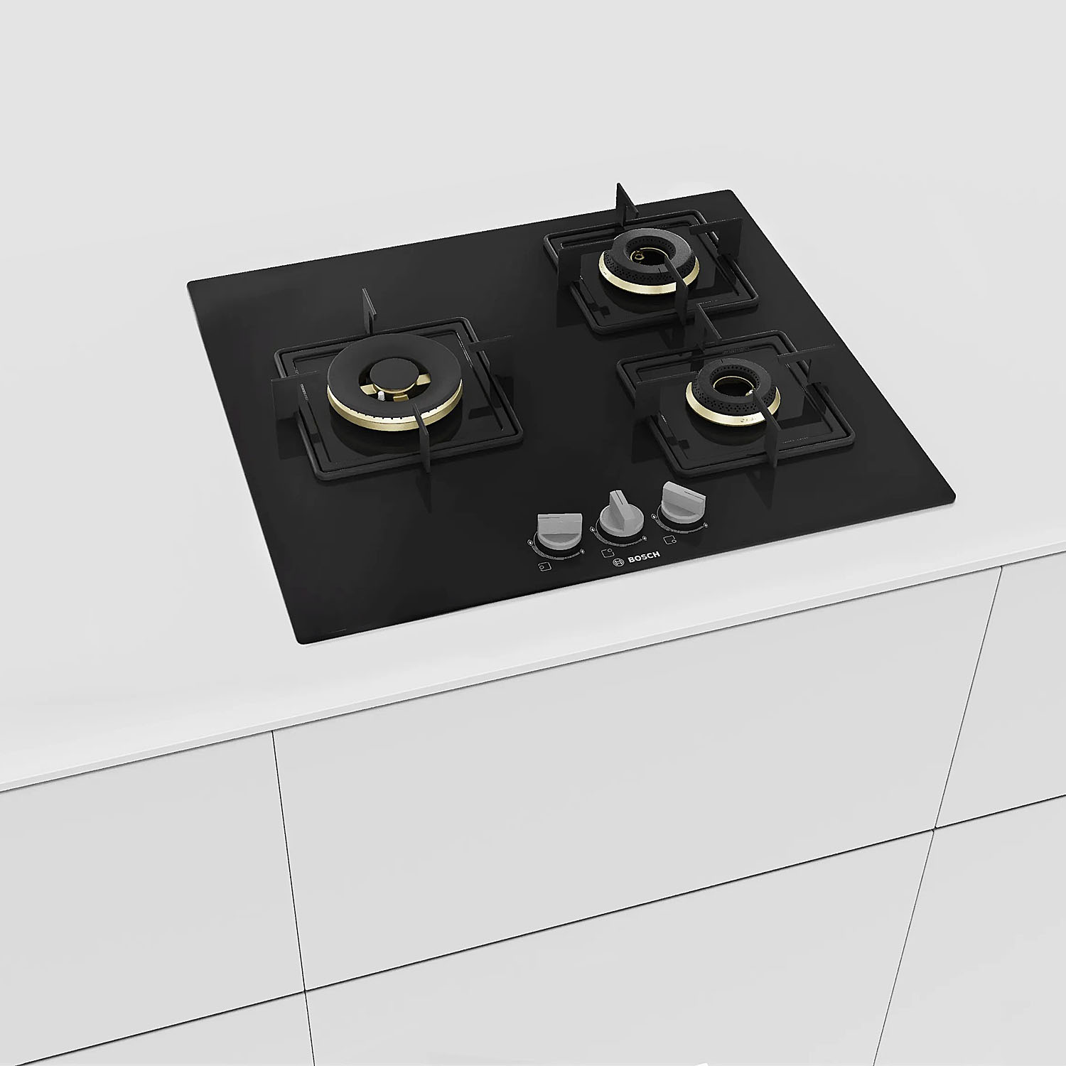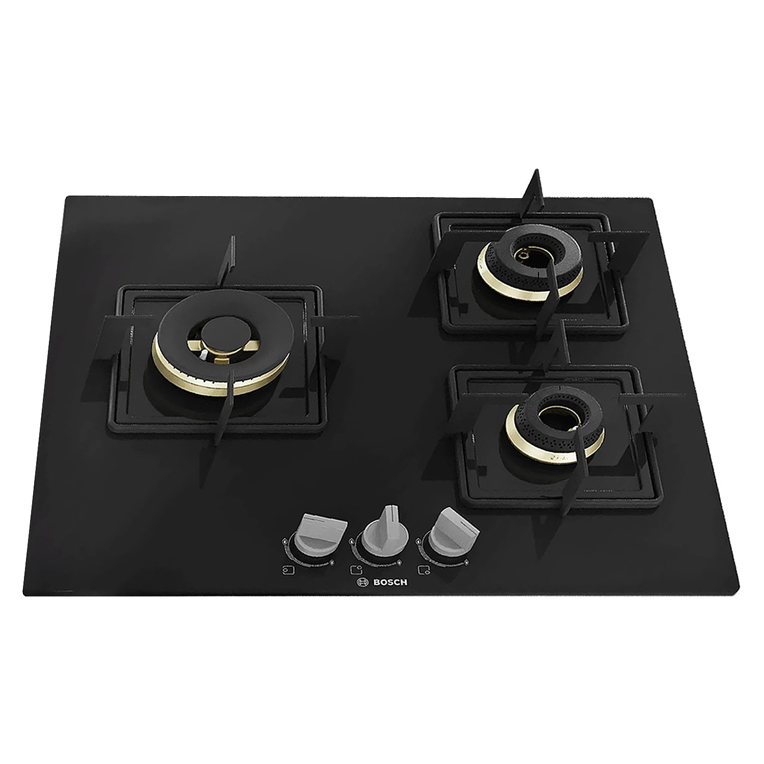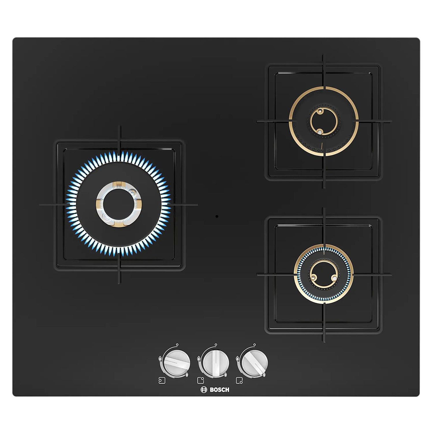 Bosch 3 Burner 60CM Built-In Hob with Tempered Glass, Auto Ignition, True Brass 2D Ring Burners and Enameld pan supports, Black, PNC6B6F10I