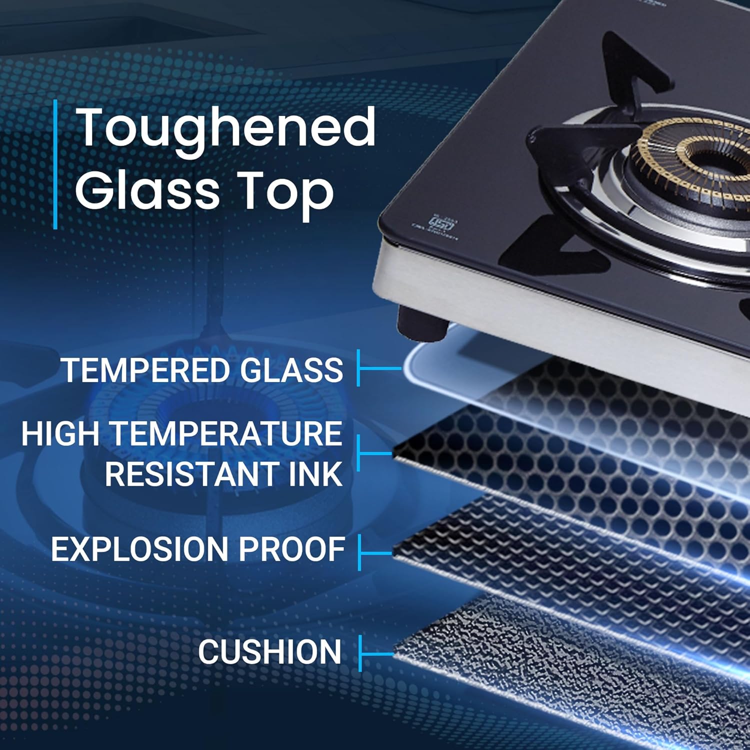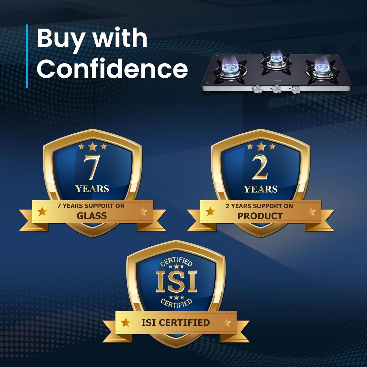 Elica-DT Series 3 Burner Manual Ignition Gas Stove, Double Drip Tray, Toughened Glass Top, High Efficiency Brass Burners, 7 Yr Glass Warranty, Black, SAPPHIRE 773 CT VETRO
