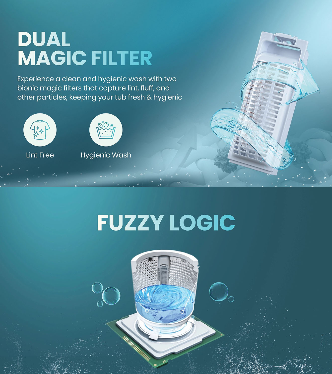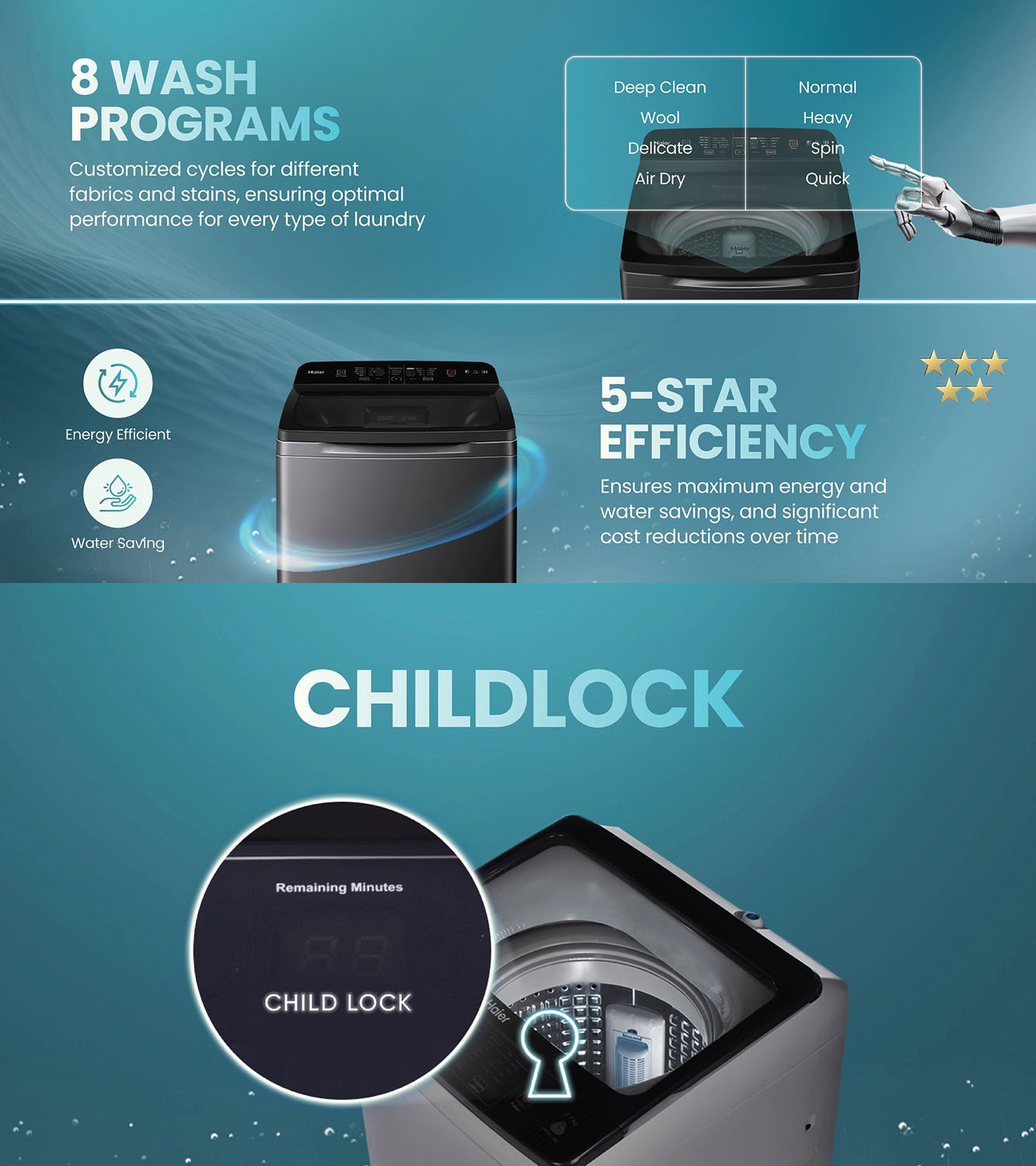 • Haier 5 Star 9 Kg Fully Automatic Top Load Washing, 15 Wash Program, Anti Scaling Technology, Oceanus Wave Drum, Toughened glass, Softfall Technology, Dual Magic Filter, Black, HWM90-H688BK