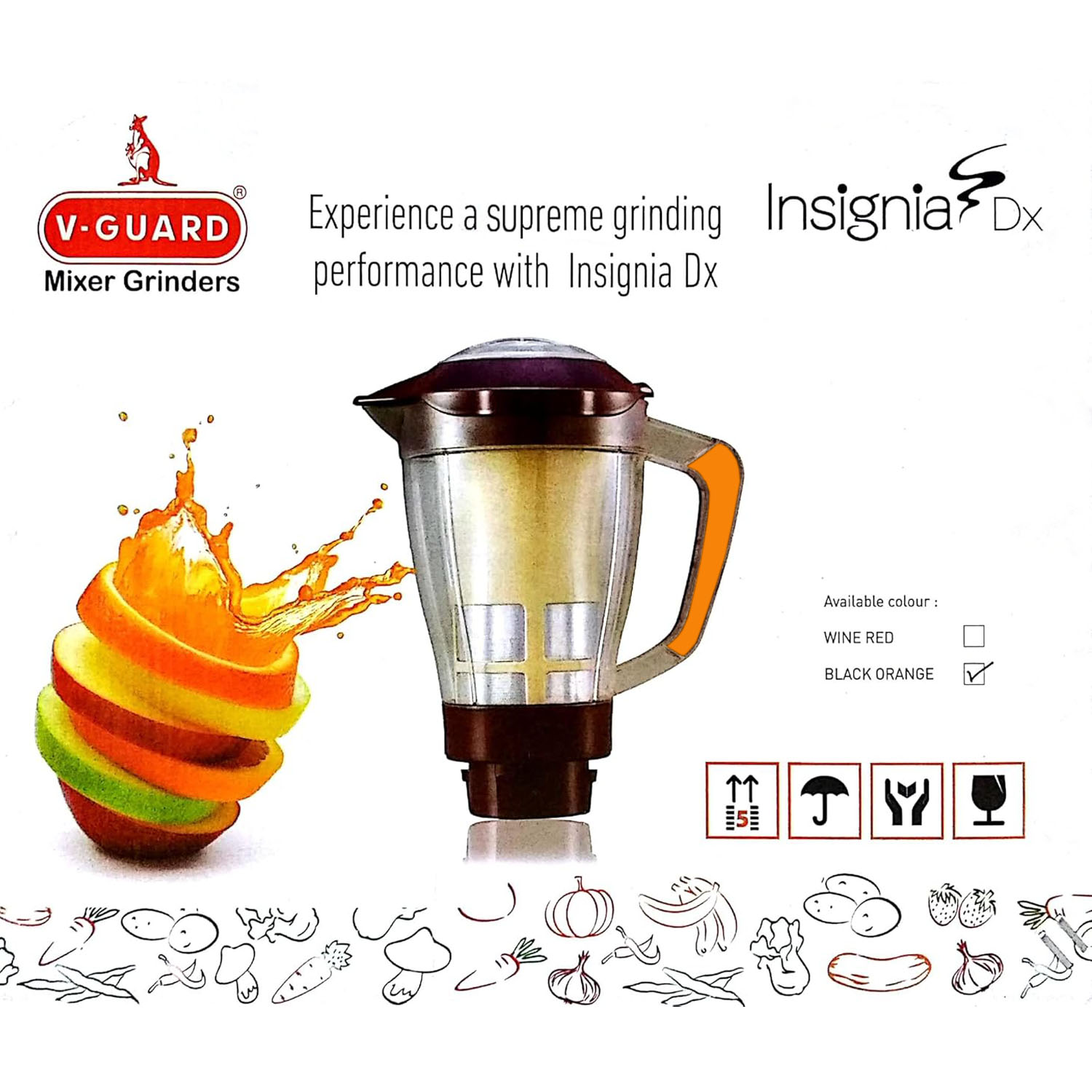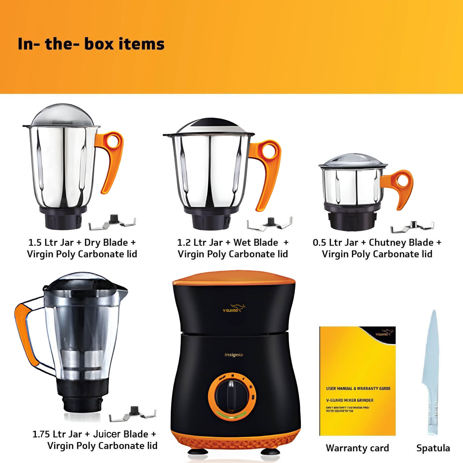 V-Guard 750 Watt, 4 Jars Juicer Mixer Grinder, Universal Copper Motor, Pulse Function & Overload Protection, Black Orange, INSIGNIA DX