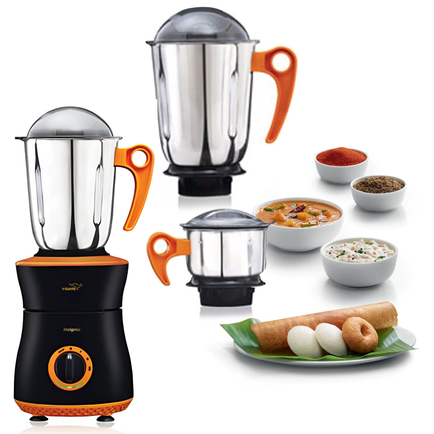 • V-Guard 750 Watt, 4 Jars Juicer Mixer Grinder, Universal Copper Motor, Pulse Function & Overload Protection, Black Orange, INSIGINA DX