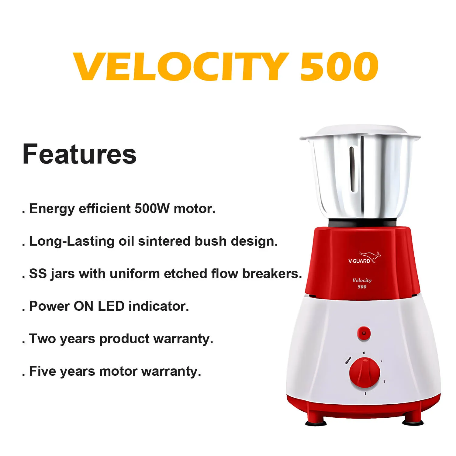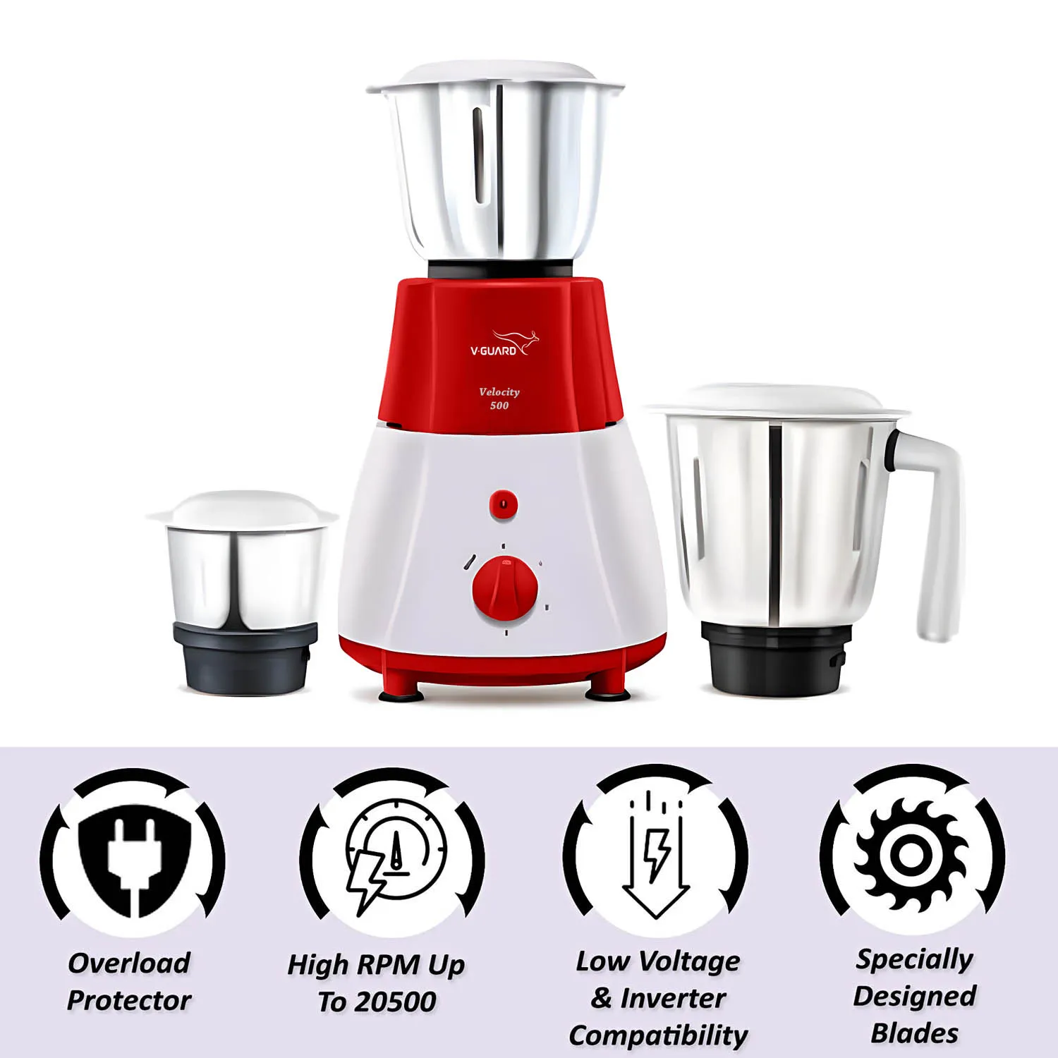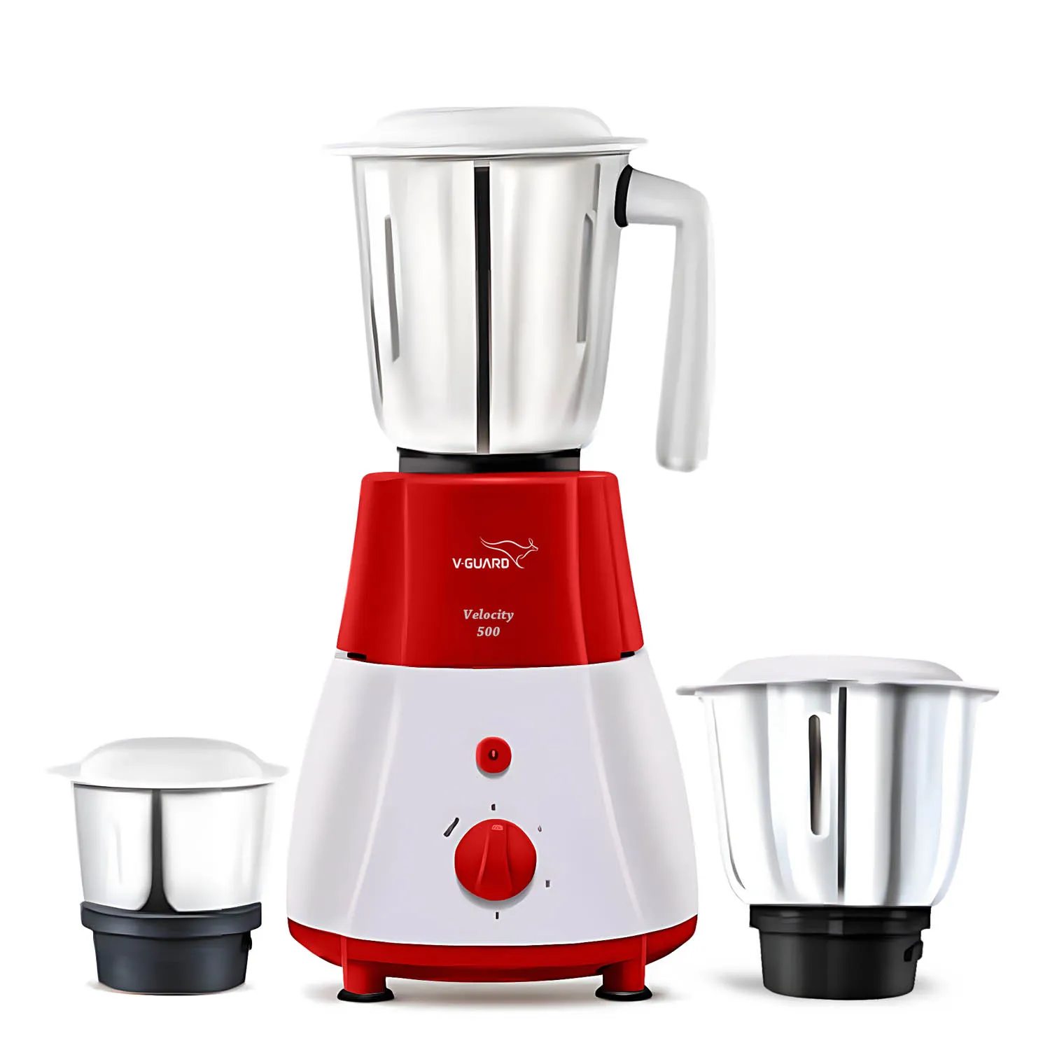 V-Guard Velocity, 500 Watt 3 Jar Mixer Grinder with Stainless Steel Jars, Compact Foot Print and 3 years Motor Warranty, Red/White