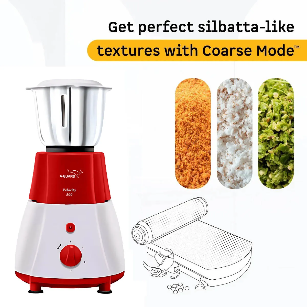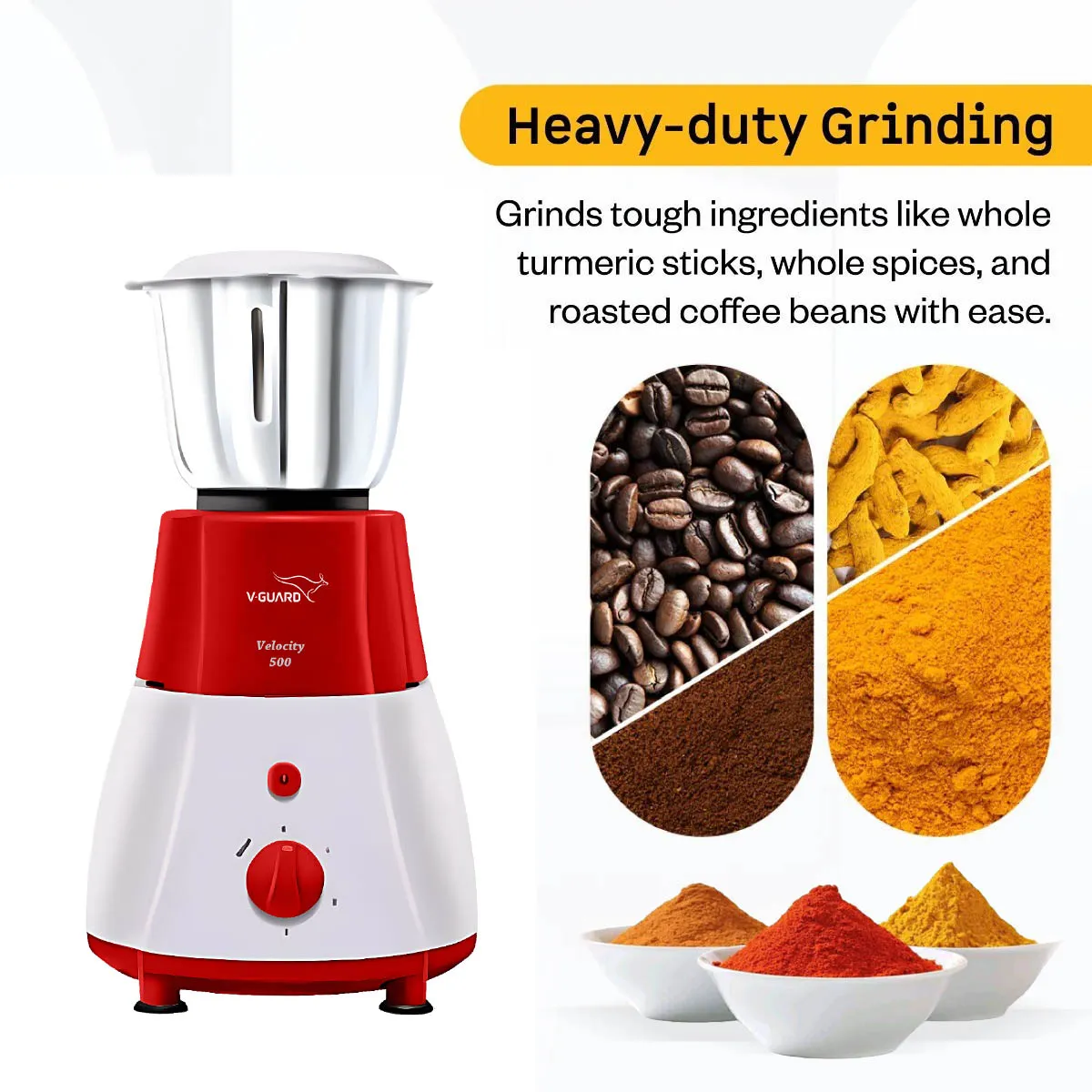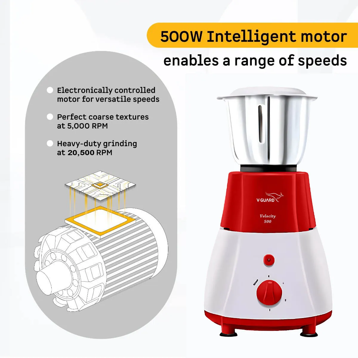 V-Guard Velocity, 500 Watt 3 Jar Mixer Grinder with Stainless Steel Jars, Compact Foot Print and 3 years Motor Warranty, Red/White
